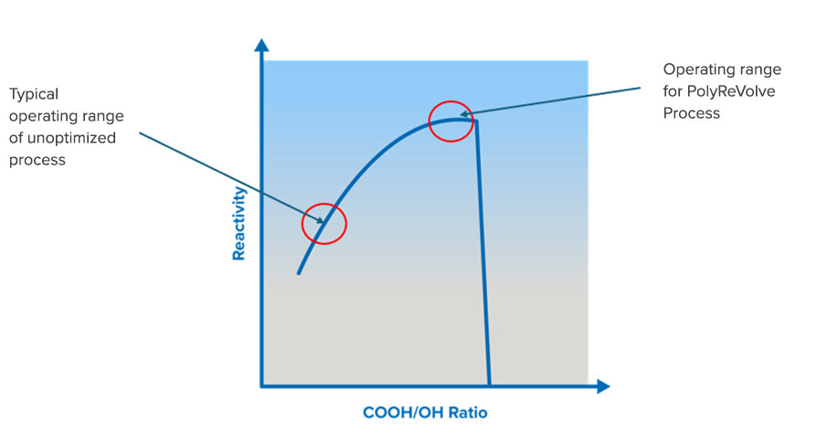 - Optimized oligomer chemistry: KTS’s IP ensures precise control over end group ratios, yielding oligomer blends that are significantly more reactive than those produced by simple glycolysis and other alternative methods. Achieving higher rPET content directly in the polymerisation reactors.